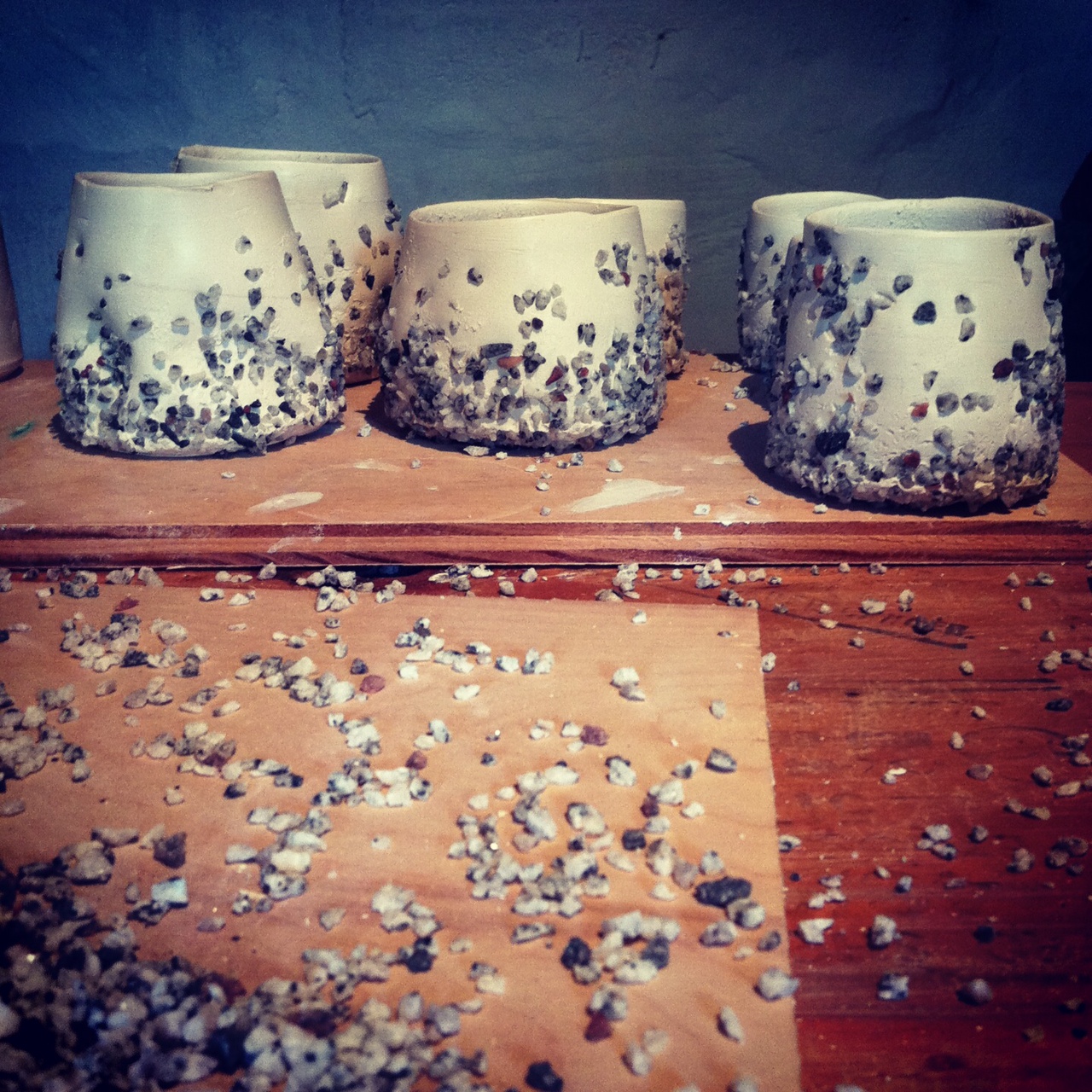 Crushed granite and a bronze glaze are my current favorites. I have also experimented a great deal with dusting different dry clay bodies on top of glazes.