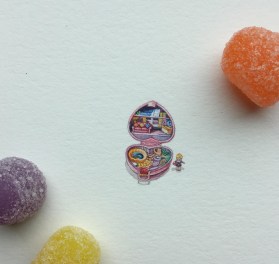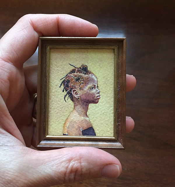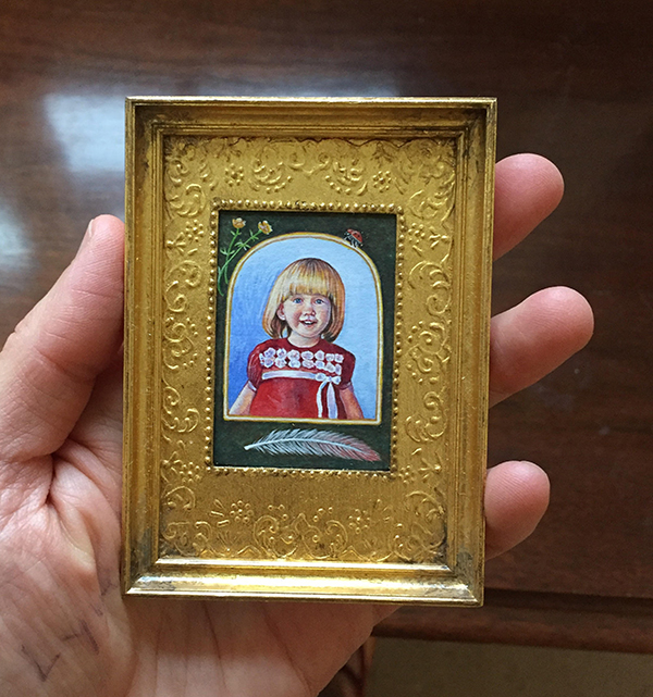 We have a wooded space behind our house. Spending time there, going on walks and the occasional yoga class are things that make me happy. I like to bake. I love to read. Before our third child was born I became a hospice volunteer. I have not been very active but hope to start participating more as the kids grow. Aging, death, grief, memories and their relationship to the quality of our daily lives are things I am curious about. Not in a morose way, but in a way that wonders how sadness and joy can go hand in hand. How do we embrace change or loss so that it doesn’t consume us? I paint a lot of nostalgic images or miniatures that have a personal meaning for people. I feel like there is direct a connection to our relationship with the transience of life and the intensity of our desire to hold onto what matters most. I like the idea of painting something meaningful in miniature to honor its place in our life and simultaneously acknowledge it’s separateness from ourselves.